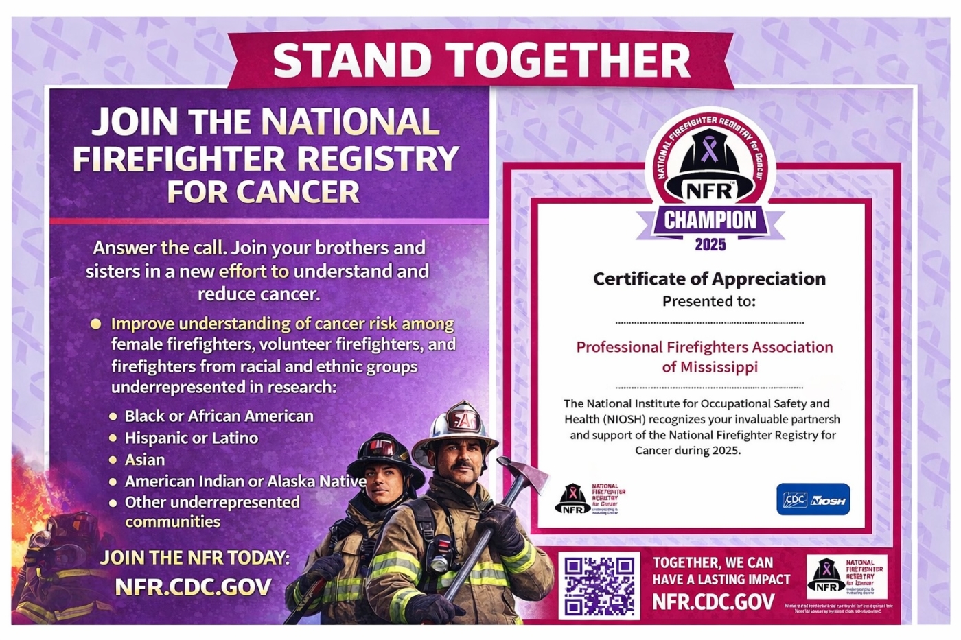 The National Firefighter Registry for Cancer has recognized the Professional Firefighters Association of Mississippi as an NFR Champion!  We look forward to continuing to support the NFR and urge you to join the largest existing effort undertaken to understand and reduce cancer among U.S. firefighters.
